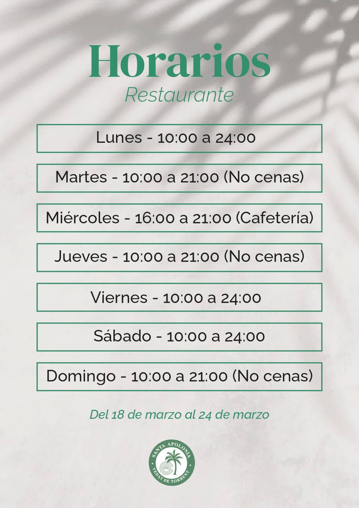 HORARIO RESTAURANTE: DEL 18 AL 24 DE MARZO