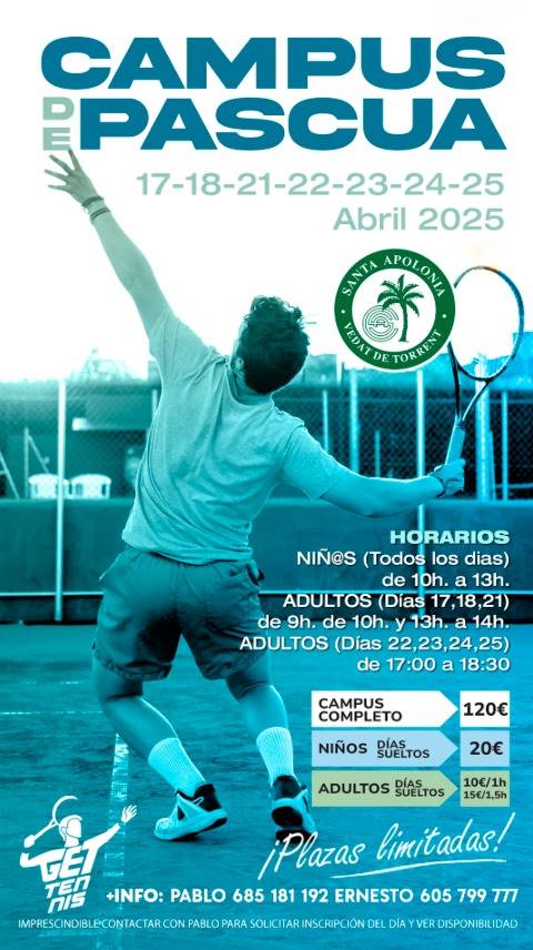 Os adjuntamos el cartel con las fechas e información del próximo CAMPUS DE TENIS DE PASCUA,  que comenzará el próximo 17 de Abril (PLAZAS LIMITADAS)