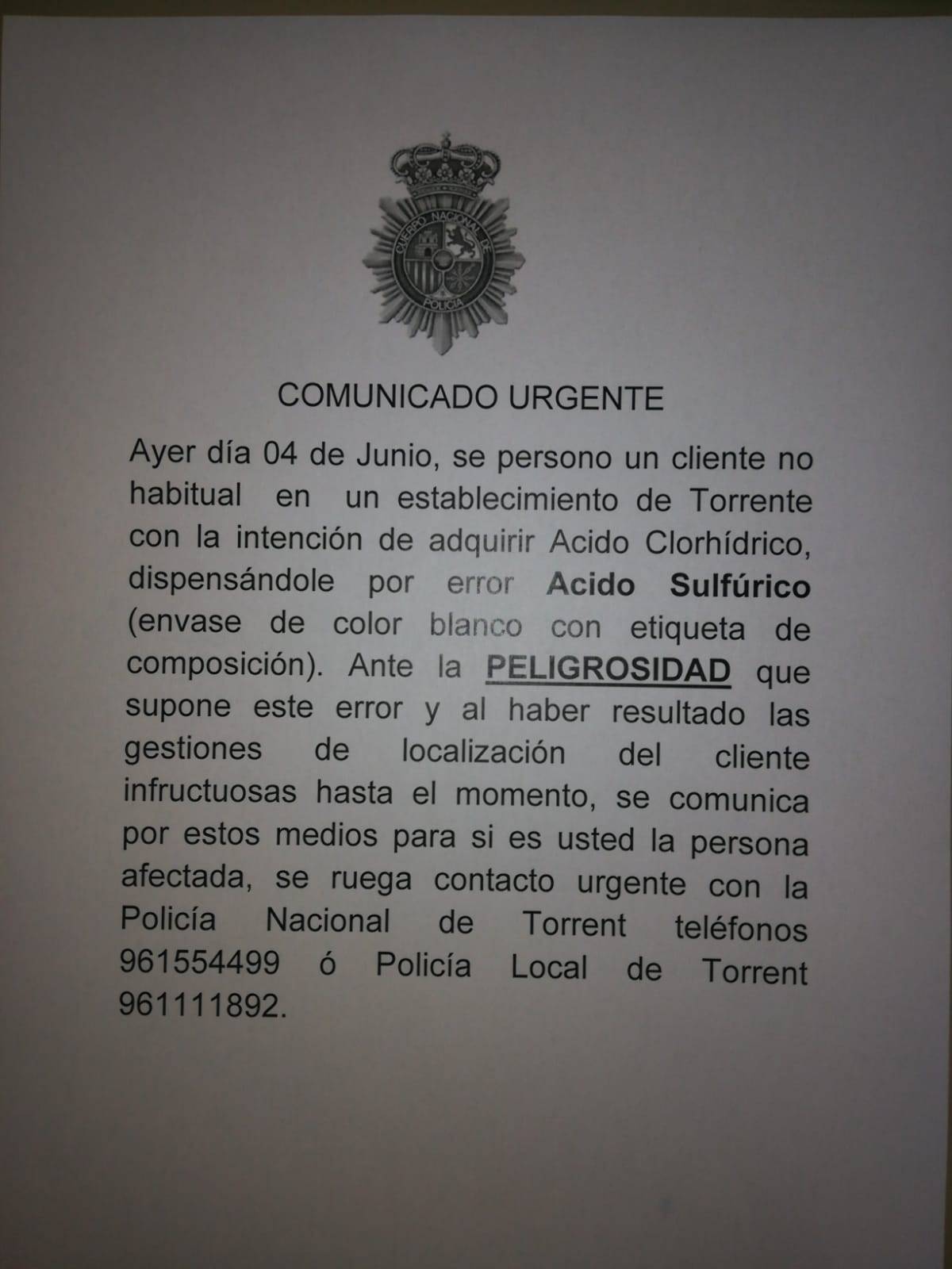 Por favor pinchad en la imagen adjunta. Se trata de un COMUNICADO que nos acaba de hacer llegar la POLICIA DE TORRENT.